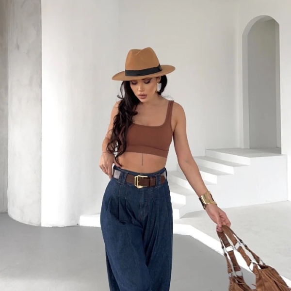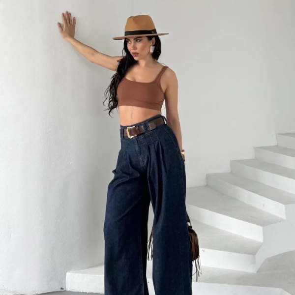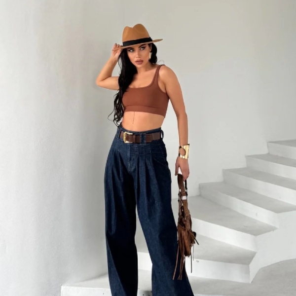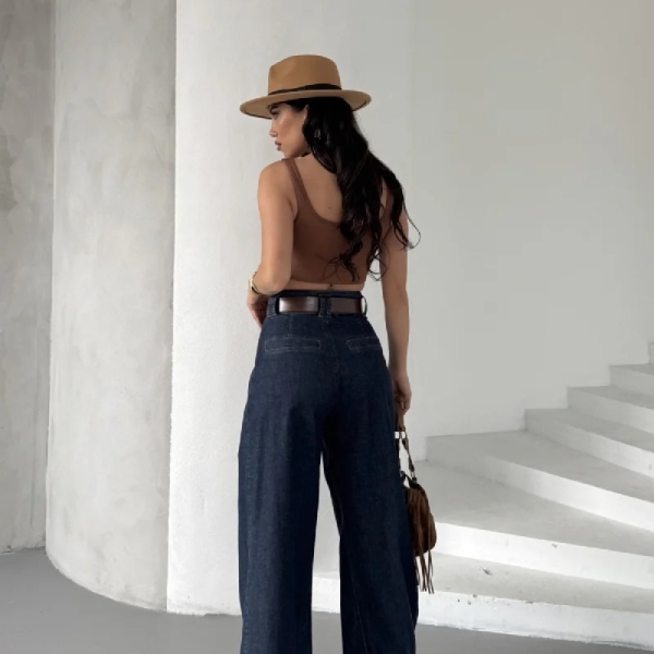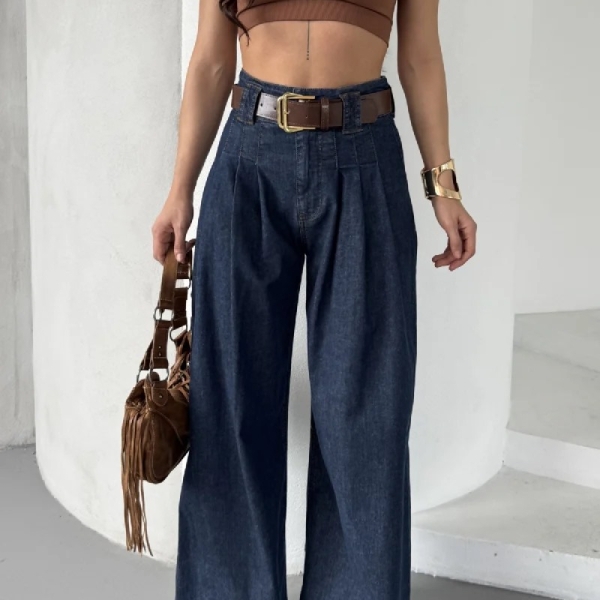 Loose-fit palazzo jeans with high waist and front pleats, made from classic textured denim. A chic and comfortable choice for effortless everyday looks. Composition: 98% cotton, 2% elastane Sizes in pack: 27:1, 28:1, 29:1, 30:1, 31:1, 32:1 Note: Belt not included in the price