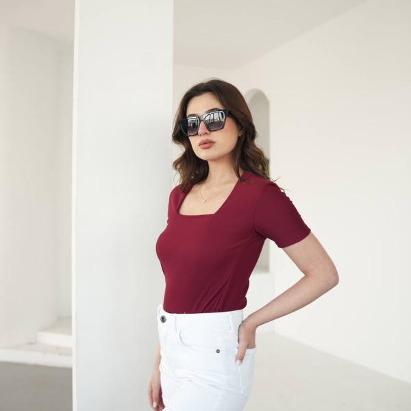Elegant burgundy fitted blouse with a square neckline, perfect for casual or sophisticated outfits. Made from stretchy and comfortable fabric, it enhances the silhouette and pairs easily with trousers or skirts.