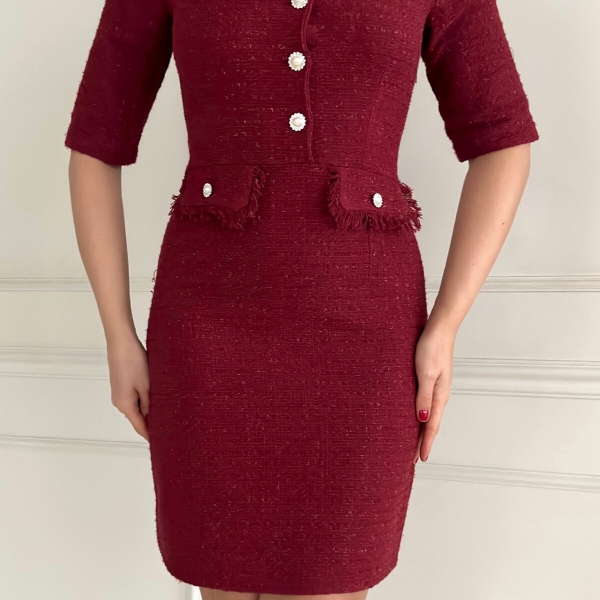 Стильное и женственное платье для офиса или особых случаев. Приталенный фасон, рукава три четверти, отложной воротник и декоративные пуговицы с жемчужным эффектом. Кармашки с бахромой добавляют образу изюминку. Материал — 100% полиэстер.