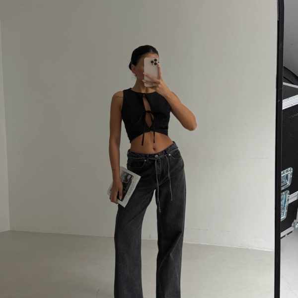 5. Black Wide-Leg Jeans with Waist Tie Detail