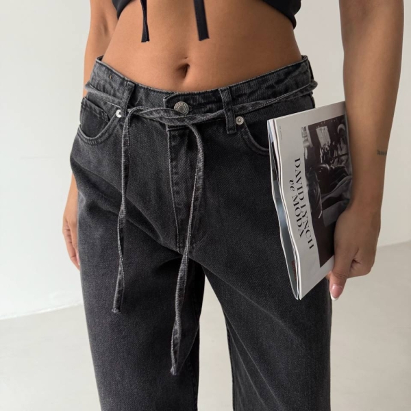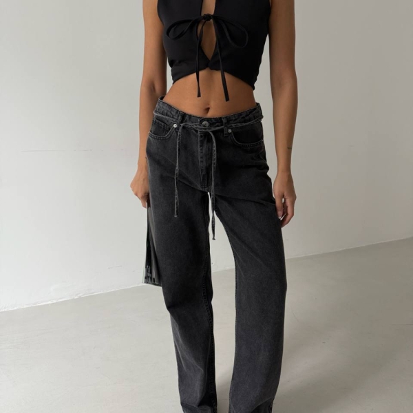 impresii despre Black Wide-Leg Jeans with Waist Tie Detail
