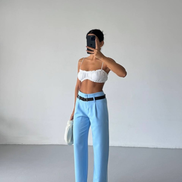 Элегантные брюки прямого кроя в нежно-голубом оттенке с завышенной талией. Идеальны для офисных и повседневных образов. Лёгкий эластичный материал обеспечивает комфорт в течение дня. Застёжка на молнию и пуговицу, имеются боковые карманы. Отлично сочетаются как с каблуками, так и с кедами.