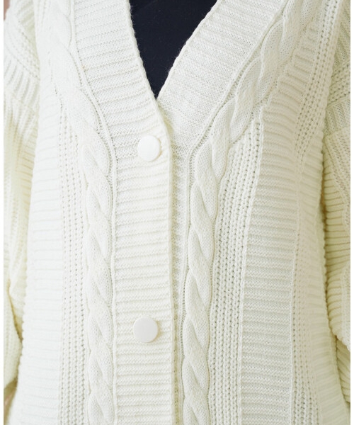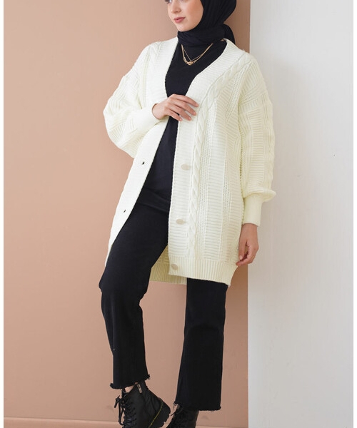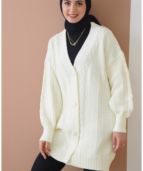 Cardigan lung și gros, de o nuanță alb-ecru, cu torsade decorative și nasturi în față. Perfect pentru zilele răcoroase, oferă un aspect cozy și elegant în același timp. Potrivit pentru layering în ținutele casual de toamnă-iarnă.