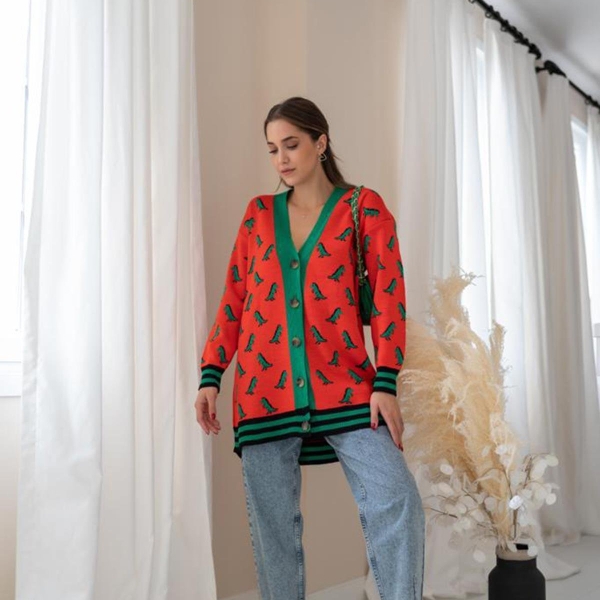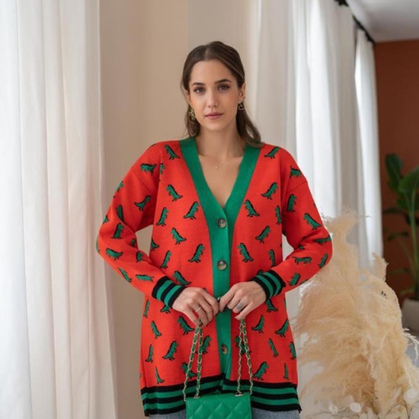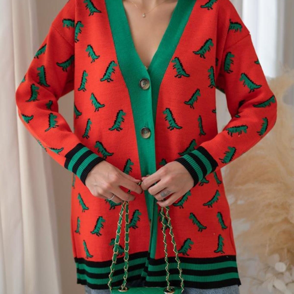 Яркий кардиган с зелёными динозаврами — смелый выбор для тех, кто не боится выделяться. Контрастная отделка и свободный крой создают эффектный образ, а пуговицы спереди делают модель удобной в носке. Отличный вариант для повседневного ношения с джинсами или брюками.