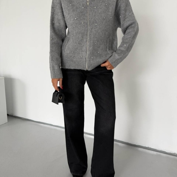 Трикотажный кардиган в изысканном оттенке, украшенный декоративными элементами в виде жемчужных акцентов. Модель оснащена фронтальной молнией, что обеспечивает удобство и универсальность в носке. Свободный крой делает кардиган подходящим для повседневных, офисных и smart-casual образов. Отлично сочетается с брюками с высокой посадкой, юбками и джинсами.