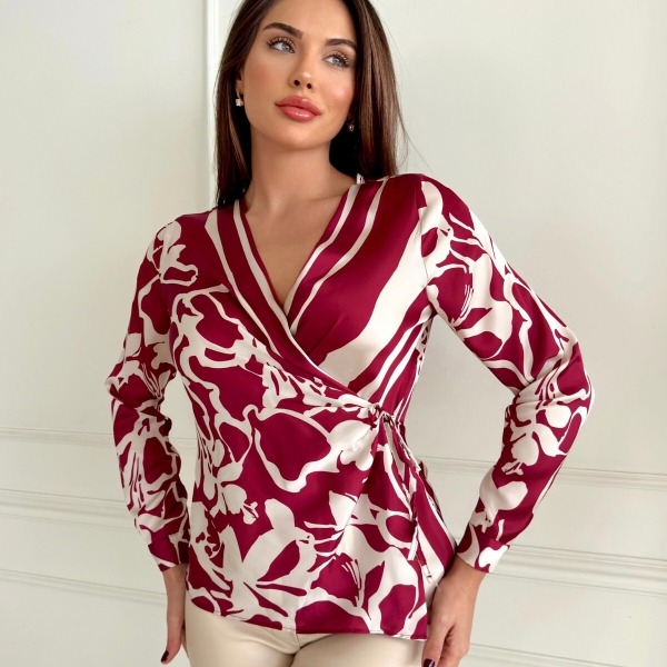 Элегантная блузка из лёгкого сатина с запахом и абстрактным бордовым цветочным узором. Лёгкий акцент на талии за счёт боковой застёжки, глубокий V-образный вырез подчёркивает женственность. Подходит для офиса или стильных выходов.