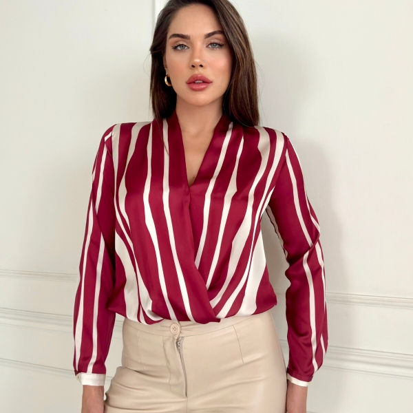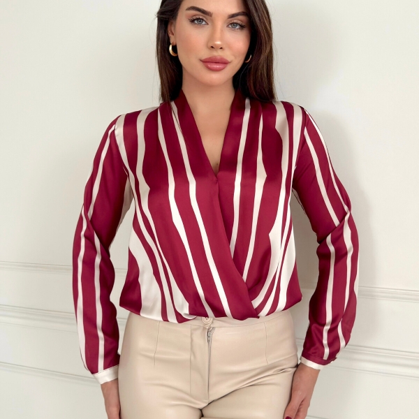 Lightweight satin wrap blouse with elegant vertical stripes in burgundy and cream. The wrap fit flatters the waist and the V-neckline adds a touch of feminine elegance. Perfect for office outfits or stylish occasions.