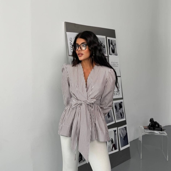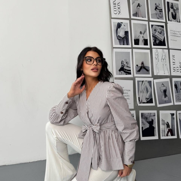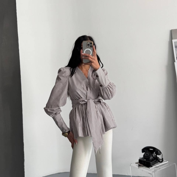 Элегантная блуза с тонкой вертикальной полоской и V-образным вырезом, дополненная эффектным узлом на талии. Лёгкие объёмные рукава и акцентированные манжеты придают образу выразительность. Идеальна для офиса, деловых встреч и стильных дневных выходов. Отлично сочетается с брюками, джинсами или юбками.