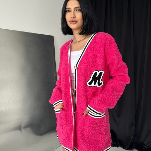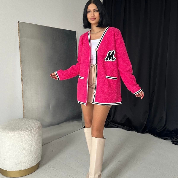 Cardiganul bouclé roz intens este alegerea perfectă pentru un look îndrăzneț și confortabil. Croiala lejeră, textura moale și detaliile sport în alb-negru oferă un echilibru între feminitate și stil urban. Aplicația „M” și buzunarele frontale completează designul modern. Ideal pentru ținute casual, streetwear sau layering în zilele răcoroase.