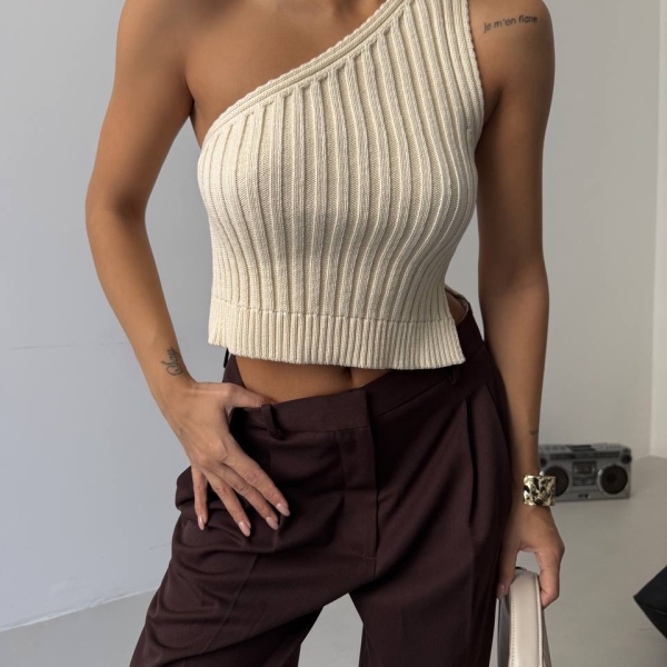 Un crop top feminin cu croială asimetrică, în nuanță de alb. Textura tricotată adaugă un plus de stil, iar forma pe un umăr îl face piesa ideală pentru zilele călduroase.
