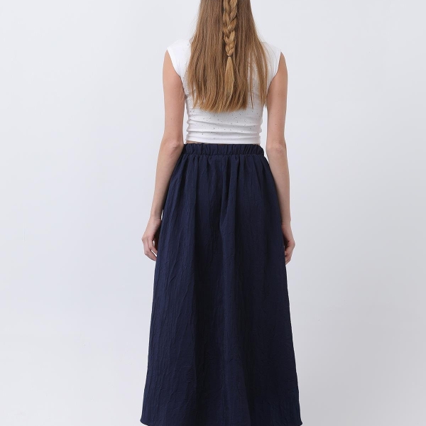 Midi skirt with a slight A-line cut, made from 100% polyester, perfect for casual or office outfits. The comfortable elastic waistband adapts nicely to any body shape. This skirt is a must-have basic in any women’s wardrobe, easy to pair with blouses, shirts or simple tops. Wear it with sandals, flats or sneakers for a modern and relaxed look. The lightweight fabric adds freedom of movement and a touch of elegance for any season. Ideal for the office, city walks or outings with friends.