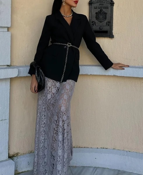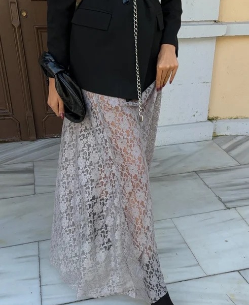 Лёгкая и изысканная макси-юбка из полупрозрачного кружева — отличный выбор для особых случаев и вечерних образов. Широкий крой придаёт воздушность, а эластичная ткань обеспечивает комфорт при носке. Легко сочетается с жакетами, элегантными топами или базовыми блузками.