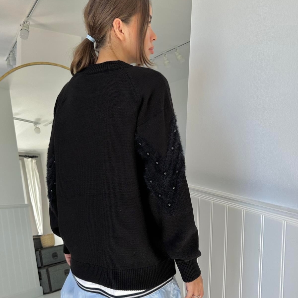 A stylish black sweater featuring a textured zigzag design and subtle pearl detailing. Perfect for polished yet cozy looks, it works well for both casual and refined outfits.