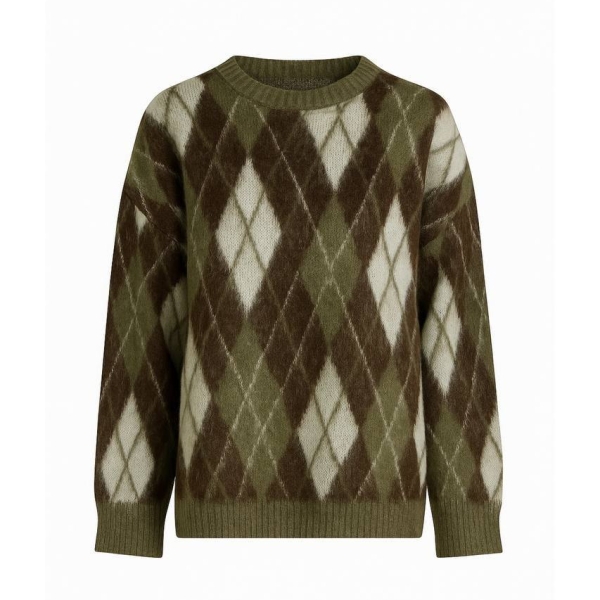 Pulover tricotat cu croială lejeră, decorat cu model argyle clasic în tonuri de verde, maro și alb, ideal pentru ținute casual sau smart-casual. Designul oversize oferă confort și libertate de mișcare, iar textura moale îl face potrivit pentru sezonul rece. Se combină ușor cu pantaloni drepți, denim sau fuste, fiind o piesă versatilă pentru garderoba de zi cu zi.