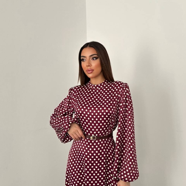 Женственное и стильное платье с горошковым принтом, придающим образу элегантность и ретро-нотку. Свободный крой красиво подчёркивает фигуру, а тонкий пояс акцентирует талию. Объёмные рукава добавляют выразительности и делают модель идеальной для повседневных выходов или особых случаев. Длина миди обеспечивает комфорт и универсальность в создании различных образов.