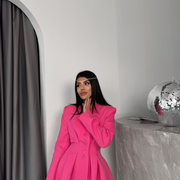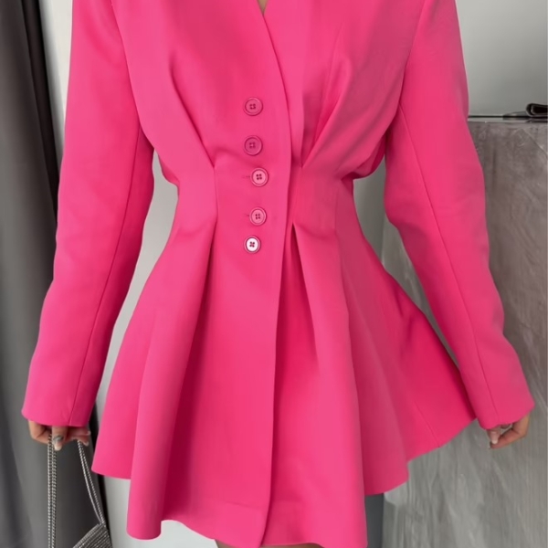 Мини-платье яркого оттенка фуксии с оригинальной застёжкой сбоку на пуговицы в тон ткани. Чёткий приталенный крой подчёркивает талию, а расклешённая юбка придаёт объём и динамику образу. Плечи со структурой и отсутствие воротника делают модель современной и выразительной. Идеально для вечеринок, мероприятий или смелых модных выходов.