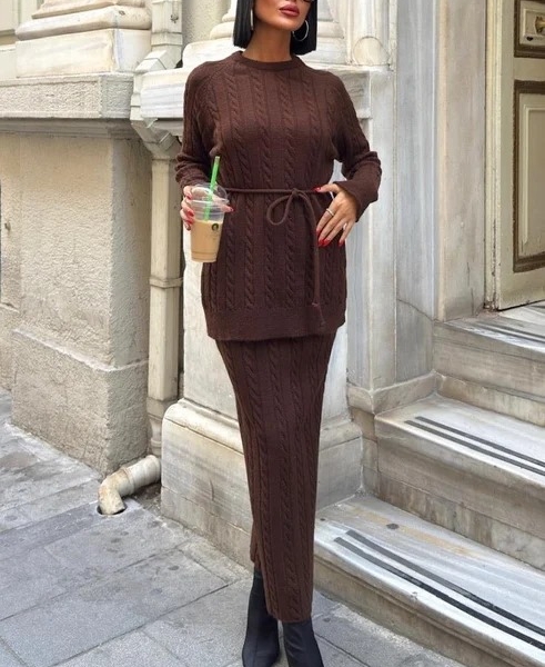 Setul tricotat compus din bluză și fustă midi se remarcă prin modelul cu torsade și designul clasic accentuat de cordonul în talie. Ideal pentru zilele răcoroase, oferă un look sofisticat fără efort. Potrivit pentru birou sau ieșiri casual. Țesătura din bumbac 100% asigură confort și respirabilitate.