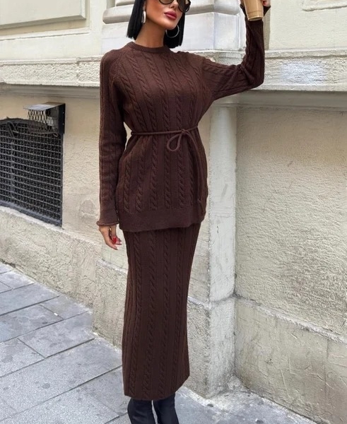 Impresii despre Costum Maro Tricotat cu Model Romb și Cordon