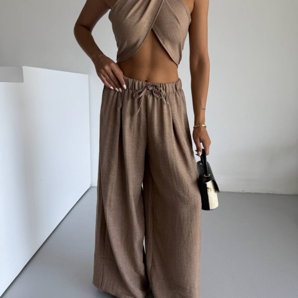 Женственный комплект, состоящий из топа с перекрёстным вырезом и широких брюк с эластичной талией. Изготовлен из 100% натурального льна. Идеален для жаркой погоды, отдыха и повседневных стильных образов.