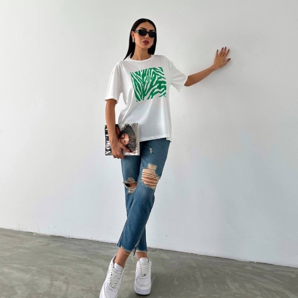 Футболка с зеленым принтом зебры — стильный элемент гардероба для повседневных образов. Минималистичный дизайн делает её универсальной и лёгкой в сочетании с джинсами, шортами или юбками. Идеальный выбор для городского лука.