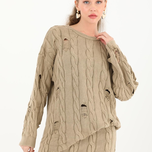 This knitted tunic with stylish distressed details is perfect for a relaxed, modern outfit. The long, loose fit flatters any body shape, while the soft knit texture keeps you cozy during colder days. Pair it with leggings, skinny jeans or boots for a trendy, laid-back look. Great for everyday wear or casual outings.