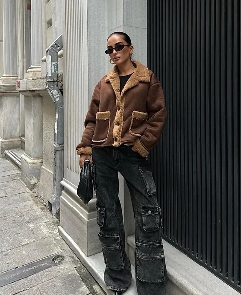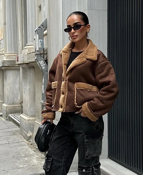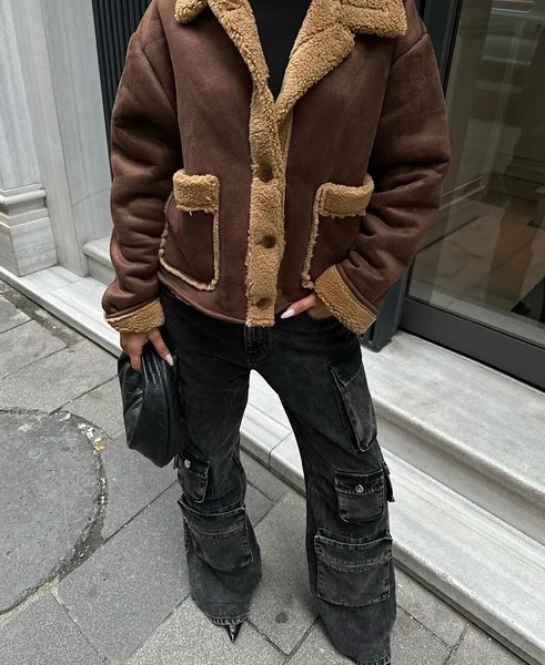 Куртка из мягкой замши с длинными рукавами — идеальный выбор для прохладной погоды. Модель с укороченным кроем, отложным воротником и накладными карманами отлично сочетается с повседневным и городским стилем. Ткань замши придает образу элегантность и обеспечивает комфорт в холодное время года.