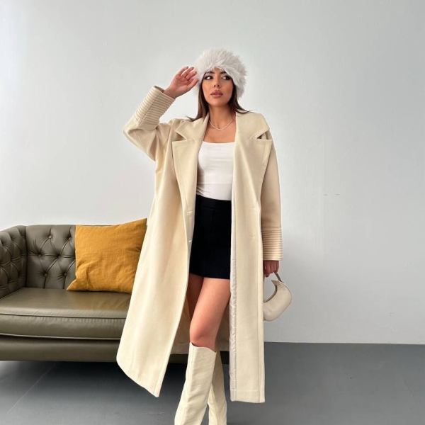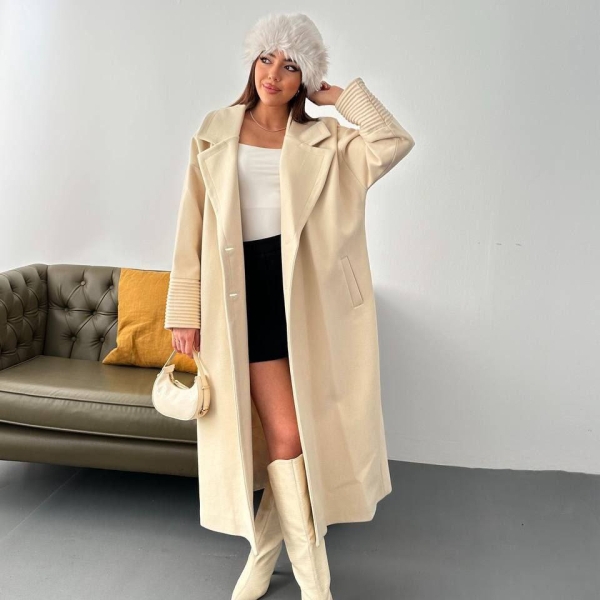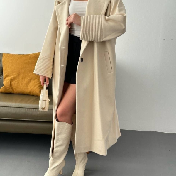 A refined long coat with a modern, relaxed silhouette, perfect for elevating stylish looks during cooler seasons. The classic lapels enhance its elegant character, while the pleated cuffs add a distinctive and fashionable touch. Side pockets provide practicality, making this coat a versatile choice for casual-chic or sophisticated city outfits. An essential outerwear piece that effortlessly combines comfort and style.