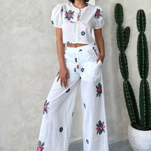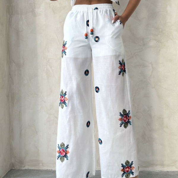 Pantaloni largi, comozi și ușori, perfecți pentru sezonul cald. Confecționați din voal alb semi-transparent, cu talie elastică și broderii florale colorate, acești pantaloni adaugă un aer boem și feminin oricărei ținute. Ideali pentru vacanțe, plimbări sau lookuri casual-chic.