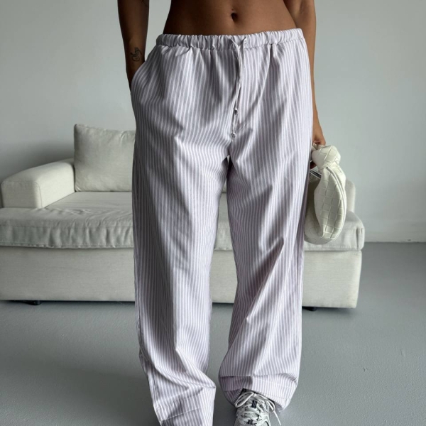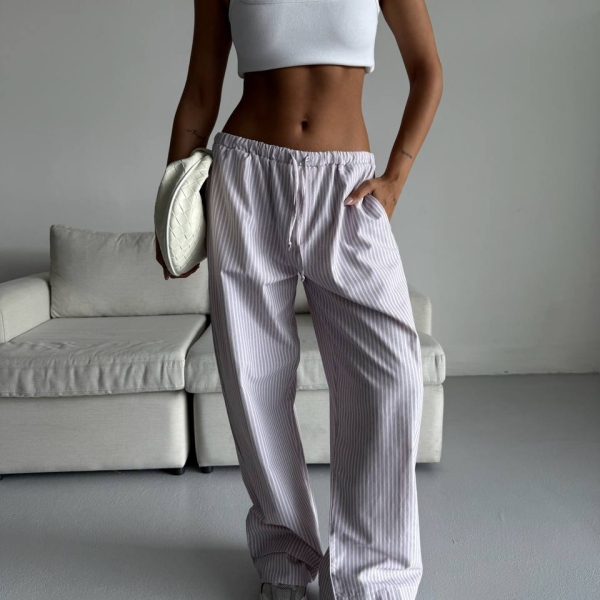 Нежный и удобный вариант на каждый день. Брюки в пудрово-розовом оттенке с полоской отлично подойдут для прогулок, отдыха и повседневных образов. Свободный крой и хлопковая ткань обеспечивают комфорт.