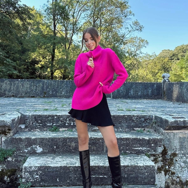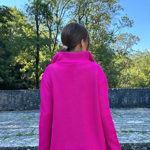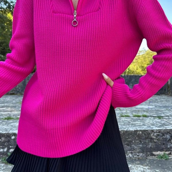 Плотный вязаный свитер насыщенного фуксийного цвета с высоким воротником и короткой молнией. Современный и удобный дизайн идеально подходит для повседневного городского образа. Легко комбинируется с джинсами или плиссированной юбкой.