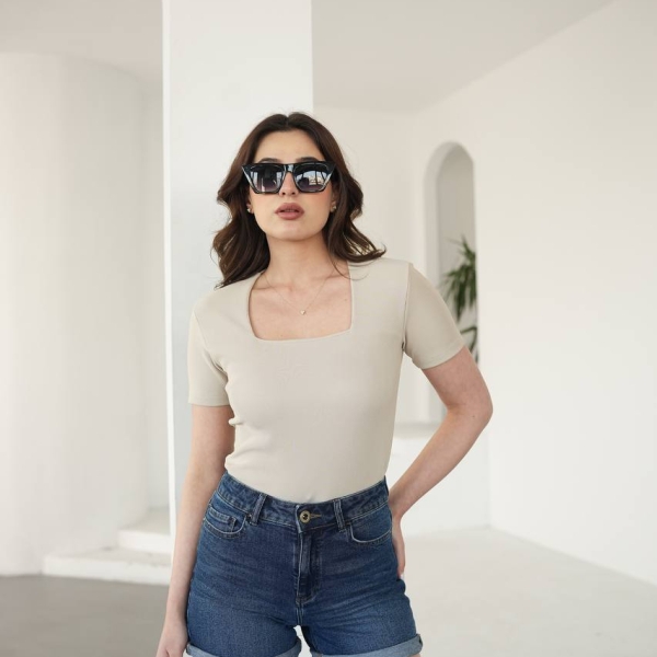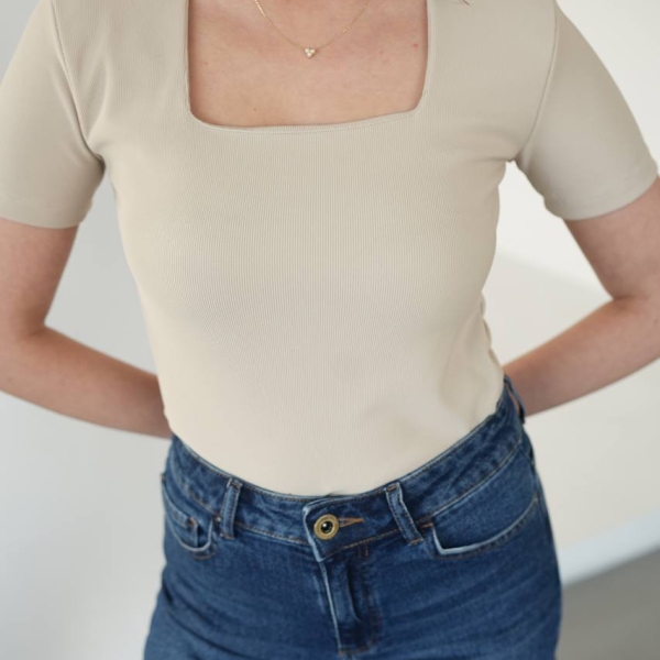 Bluză crem feminină, cu decolteu pătrat și croială mulată, ideală pentru ținute casual sau elegante. Realizată din material elastic și confortabil, această bluză pune în valoare silueta și este ușor de asortat cu pantaloni sau fuste.