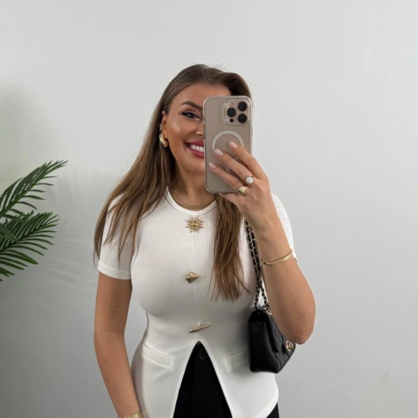 Această bluză albă cu mânecă scurtă și croială cambrată evidențiază perfect silueta feminină. Detaliile metalice decorative pe linia frontală adaugă un plus de eleganță, iar tăietura în V la bază oferă un aer modern. Ideală pentru ținute de birou sau casual-chic.