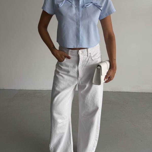 Укороченная рубашка из 100% хлопка с короткими рукавами и декоративными бантиками спереди. Лёгкая и женственная модель, идеально подходящая для летних образов. Отлично сочетается с юбками, джинсами с высокой талией или шортами.