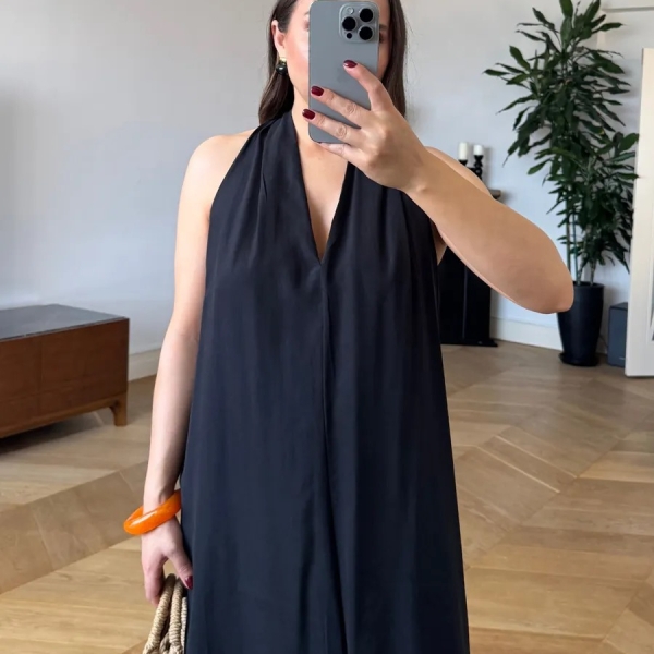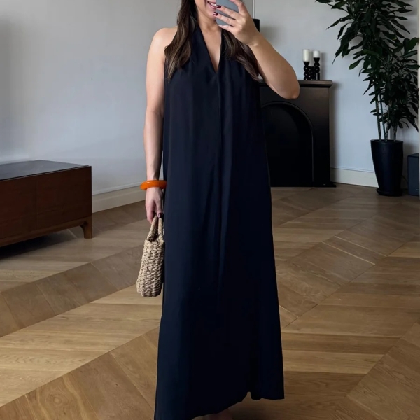 Această rochie fără mâneci, cu croială lejeră și decolteu adânc, impresionează prin spatele decupat și designul minimalist. Ideală pentru zilele toride sau evenimente în aer liber, oferă confort și eleganță într-un singur look.