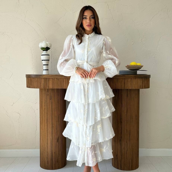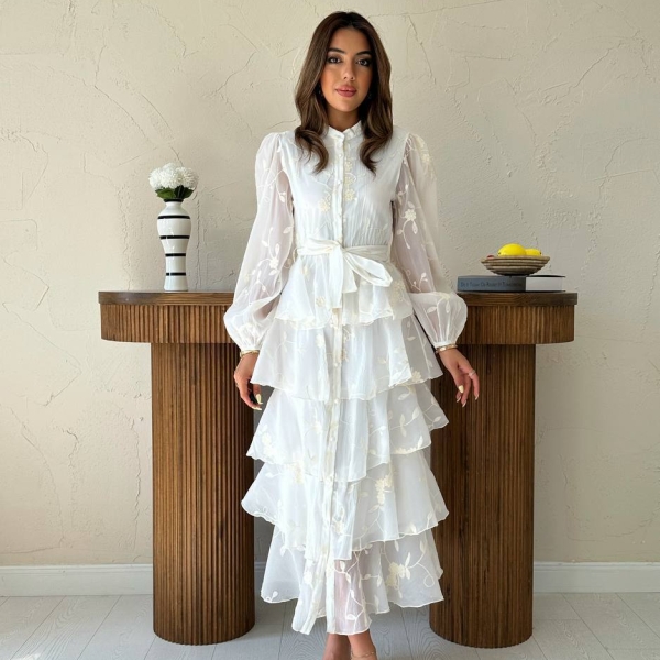 About this product White Midi Dress with Floral Print and Layered Ruffles