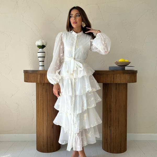 An elegant midi dress featuring a white floral print on a black background, creating a refined and romantic look. The layered ruffles add movement and femininity, while the defined waist with a matching belt highlights the silhouette beautifully. Long slightly puffed sleeves and a relaxed cut ensure both comfort and sophistication. Perfect for special events, parties, dinners, or polished daytime outfits when styled with heels or elegant sandals.