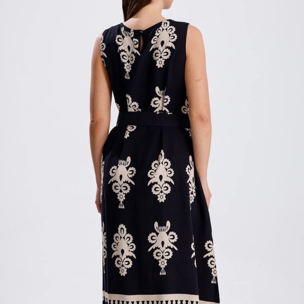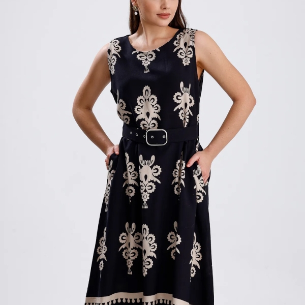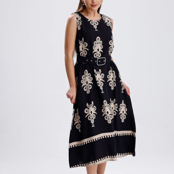 Женское платье миди из 100% вискозы с элегантным геометрическим принтом и поясом, подчёркивающим талию. Свободный фасон без рукавов отлично подходит для жарких дней, а длина миди придаёт образу утончённость. Идеально для офиса, прогулок по городу или неформальных встреч. Легко сочетается с сандалиями или туфлями на каблуке. Универсальная модель для летнего гардероба.