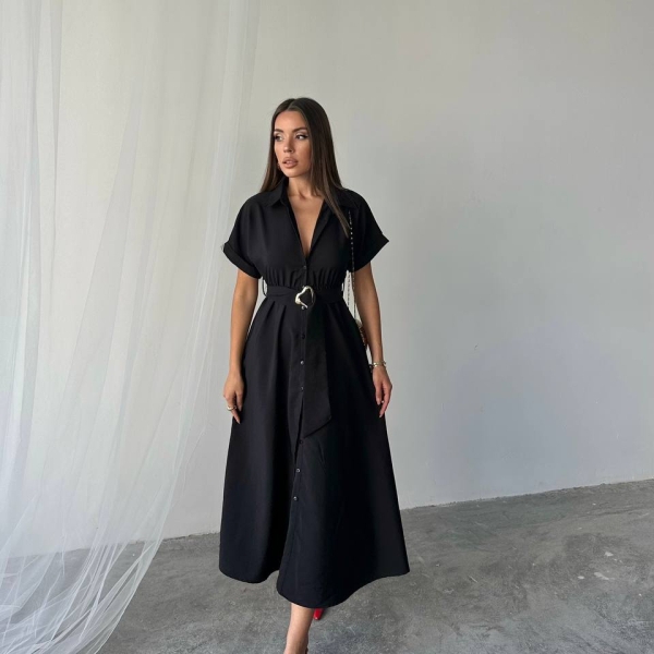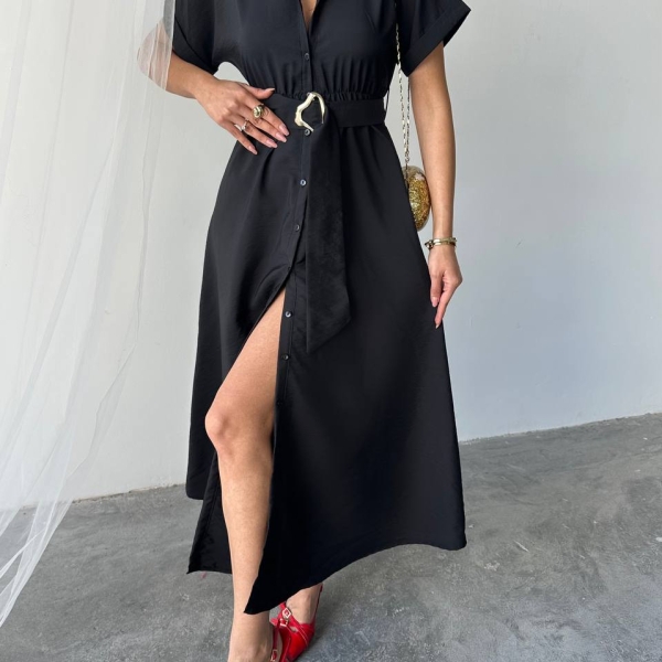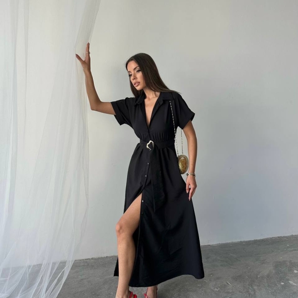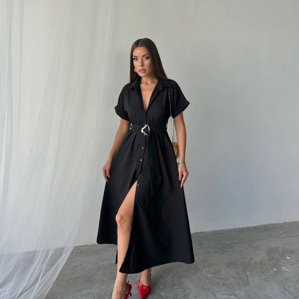 Миди-платье-рубашка чёрного цвета с поясом и металлической пряжкой, подчёркивающей талию. Пуговицы спереди и высокий разрез добавляют образу лёгкости и женственности. Классический воротник, короткие рукава и лаконичный фасон делают платье универсальным выбором для города, офиса или вечерних выходов.