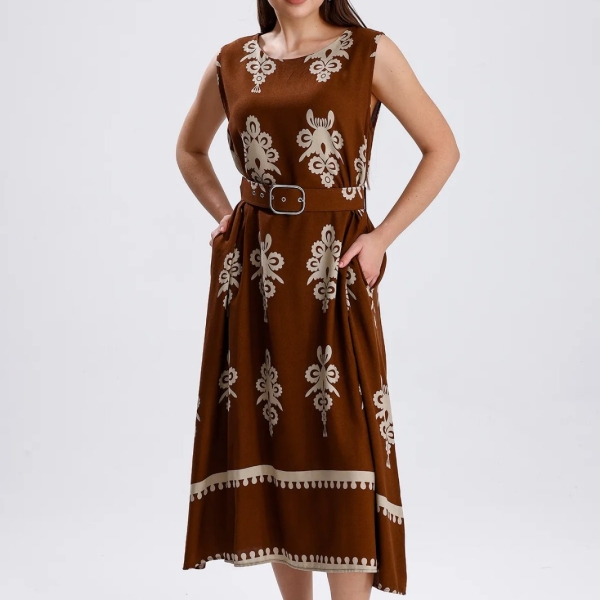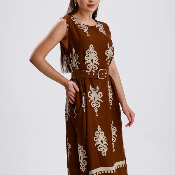 5. Коричневое платье миди без рукавов с геометрическим принтом и поясом