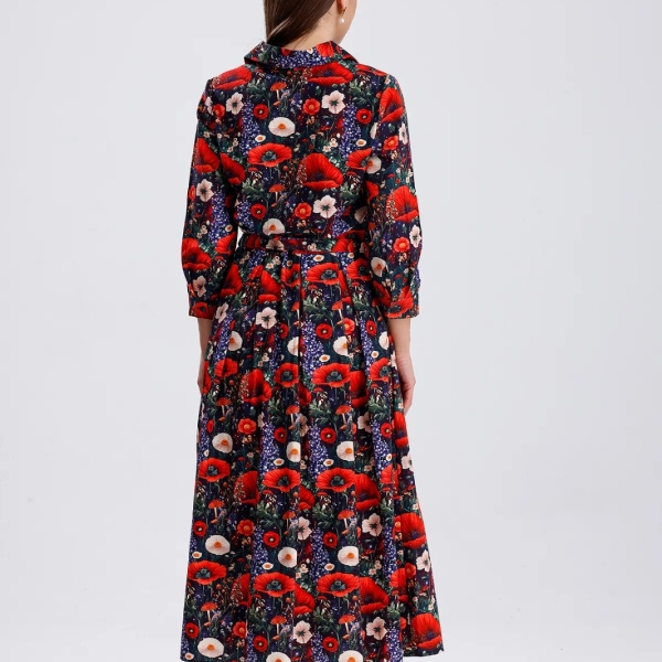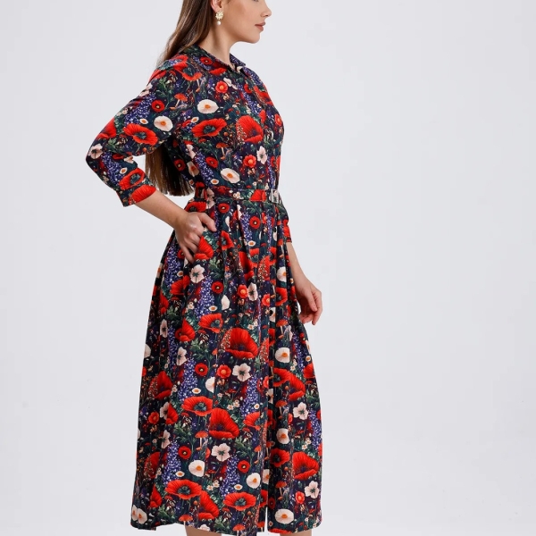 Rochie midi cu imprimeu floral cu maci și curea în talie