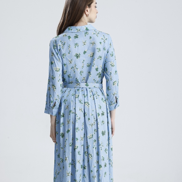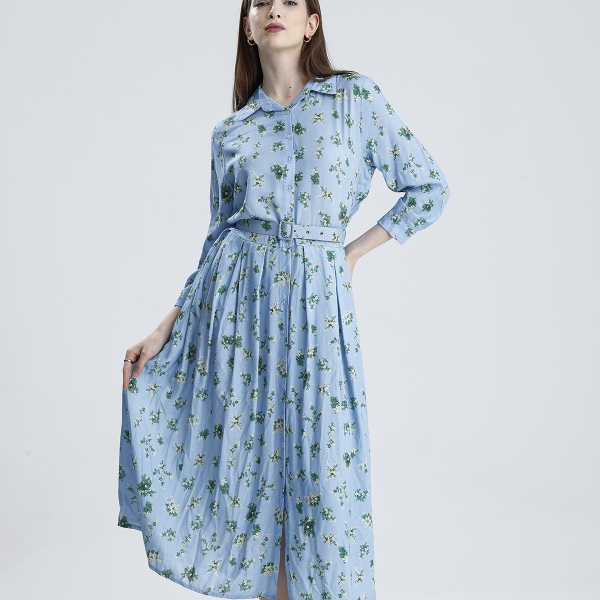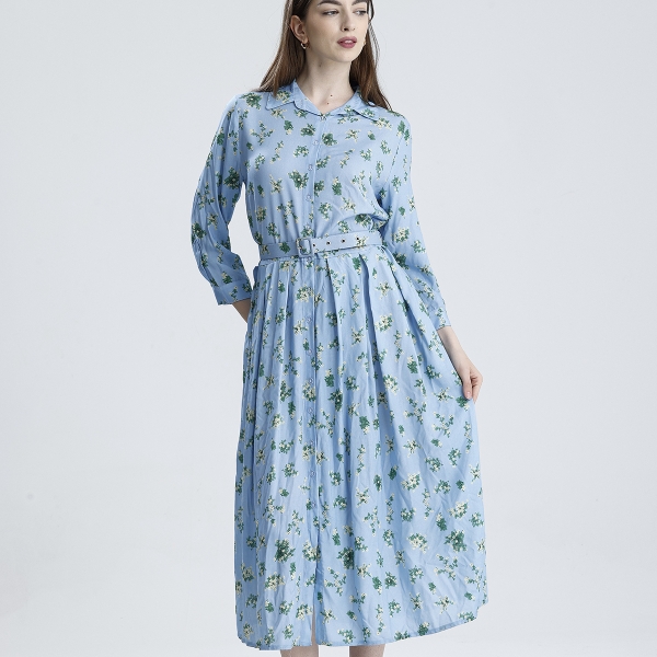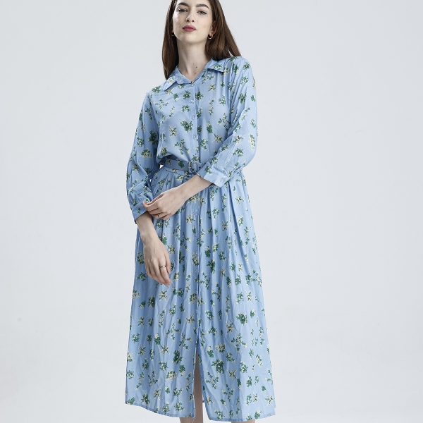 Платье-рубашка миди с нежным цветочным принтом, выполненное из 100% вискозы — отличный выбор для женственных образов на каждый день. Классический воротник, длинные рукава и застежка на пуговицы по всей длине создают элегантный силуэт. Талия подчёркнута поясом из той же ткани, что добавляет изящества. Идеально подходит для весенне-летнего сезона, легко комбинируется для офиса, прогулок или повседневных мероприятий. Практичная и удобная модель.
