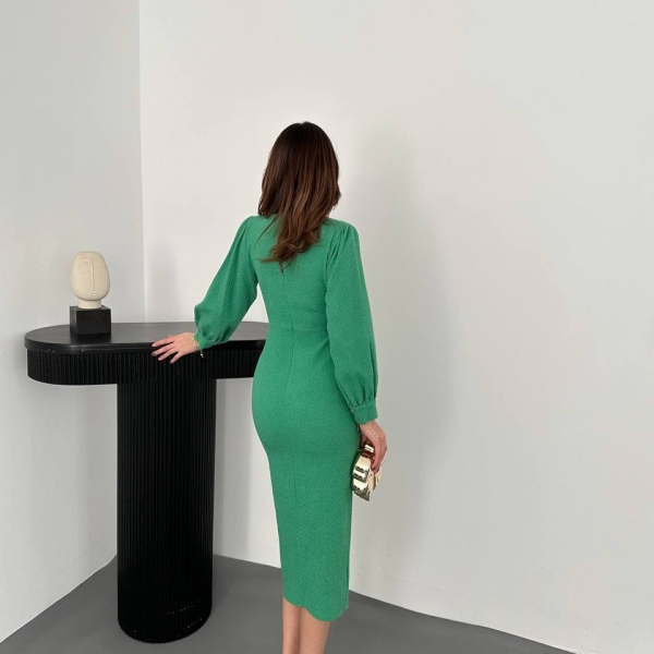 Элегантное миди-платье с женственным силуэтом и фактурной тканью подчеркивает утончённый стиль. Закруглённый вырез с декоративной цепочкой придаёт образу изысканность, а выделенная линия талии красиво формирует фигуру. Длинные рукава с мягкими манжетами добавляют нотку романтичности, делая модель идеальной для особых случаев и повседневных образов. Разрез спереди обеспечивает комфорт и современный акцент, подчёркивая уверенность и стиль.