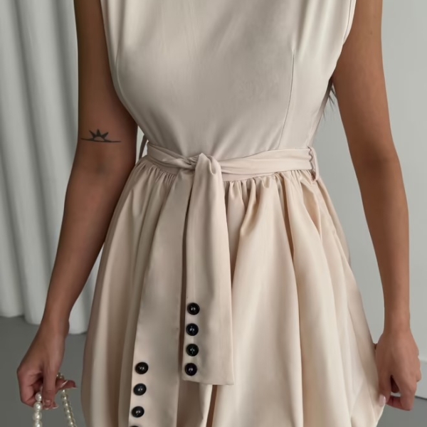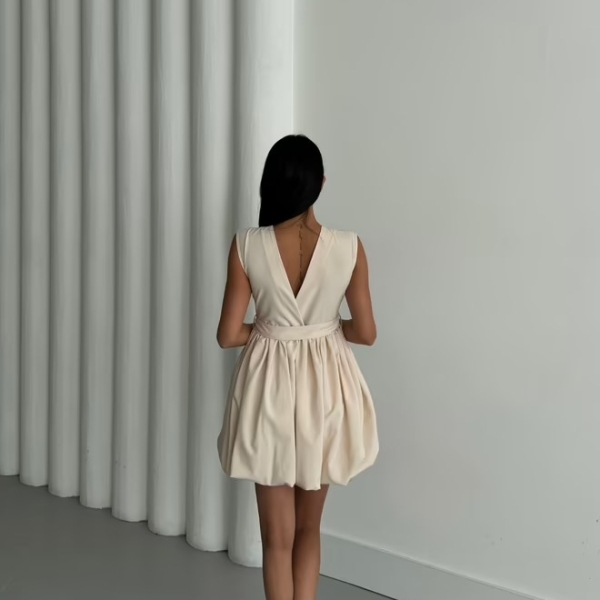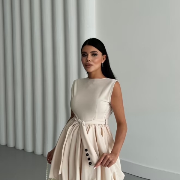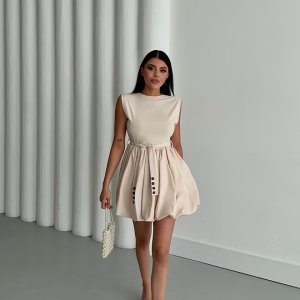 Элегантное кремовое мини-платье с объемной юбкой-баллоном, придающей образу динамичность и оригинальность. Верх платья — лаконичный и без рукавов, что уравновешивает выразительный низ. Акцент на талии подчеркивается складками и черными декоративными пуговицами, создающими лёгкий контраст. Идеально подойдёт для дневных мероприятий, вечеринок или стильных выходов.