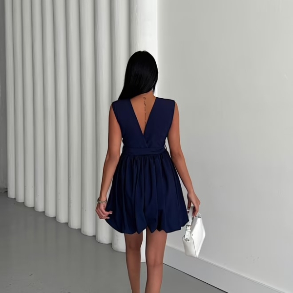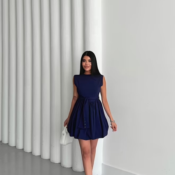 Элегантное темно-синее мини-платье с объемной юбкой-баллоном, придающей образу динамичность и оригинальность. Верх платья — лаконичный и без рукавов, что уравновешивает выразительный низ. Акцент на талии подчеркивается складками и черными декоративными пуговицами, создающими лёгкий контраст. Идеально подойдёт для дневных мероприятий, вечеринок или стильных выходов.