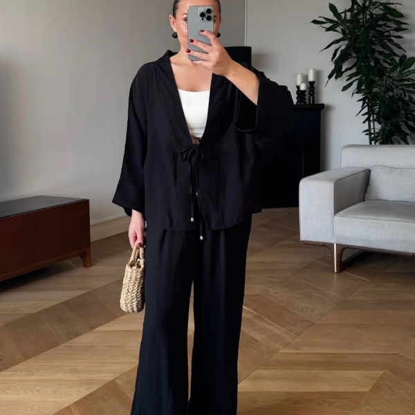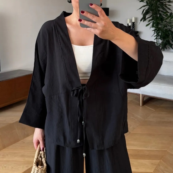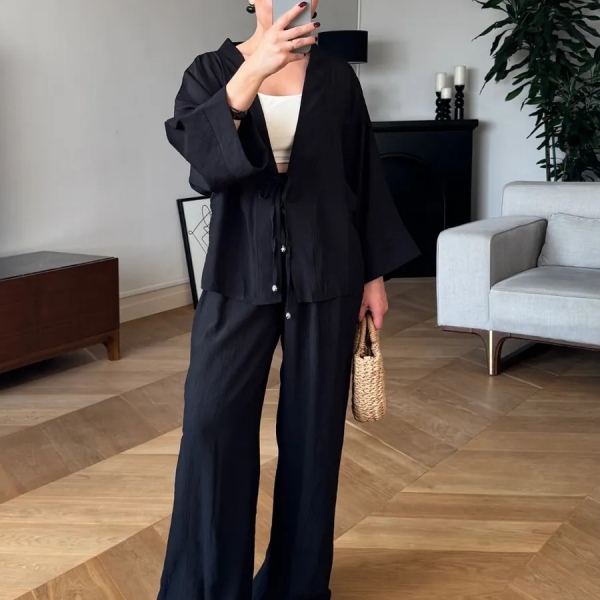 Set relaxat format din kimono cu mâneci largi și pantaloni palazzo cu talie elastică și șnur ajustabil. Țesătura naturală și ușor texturată conferă confort și respirabilitate, ideal pentru zilele călduroase sau outfituri casual-chic. Poate fi purtat ca atare sau accesorizat pentru un look urban elegant.