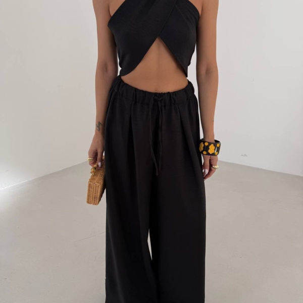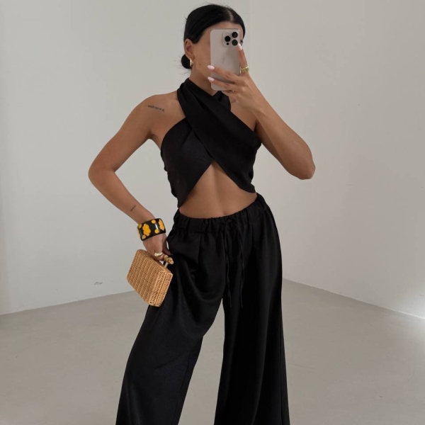 Informatii despre produs Черный сет из перекрёстного топа и льняных широких брюк