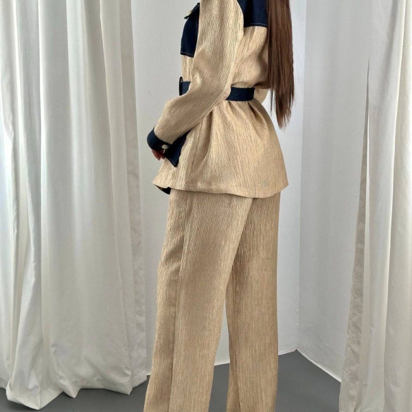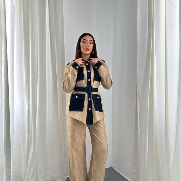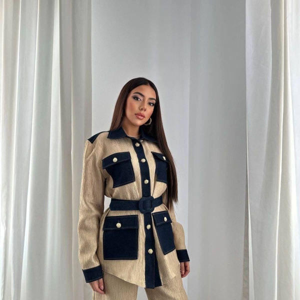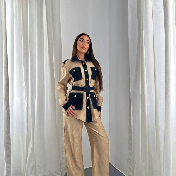 Стильный комплект, состоящий из контрастной рубашки и широких брюк — идеальный выбор для современного и утончённого образа. Рубашка украшена накладными карманами, золотистыми металлическими пуговицами и контрастными манжетами, что придаёт ей премиальный вид. Брюки прямого, свободного кроя визуально удлиняют силуэт и обеспечивают комфорт в течение всего дня. Мягкая текстура ткани и гармоничное сочетание оттенков делают этот комплект подходящим для мероприятий, офиса и элегантных выходов.