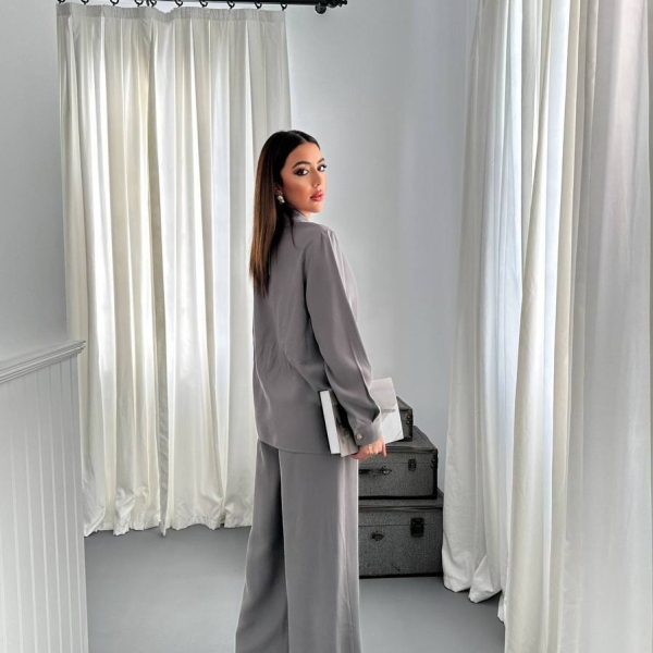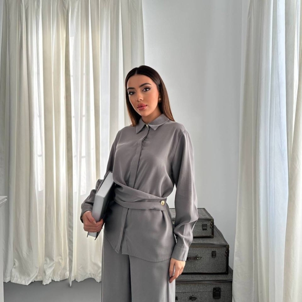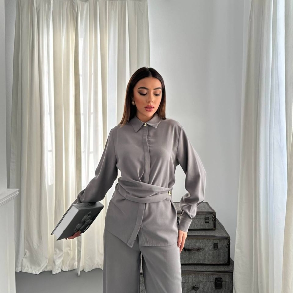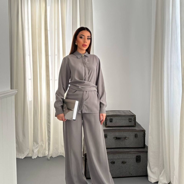 Informatii despre produs Серый Комплект с Драпированной Рубашкой и Широкими Брюками