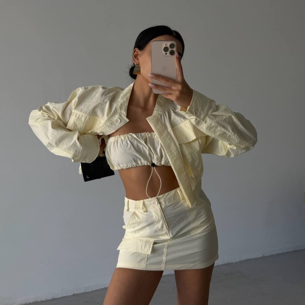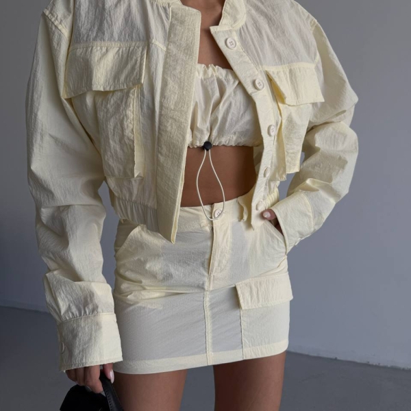 5. Тройной кремовый комплект: укороченная куртка, топ и мини-юбка