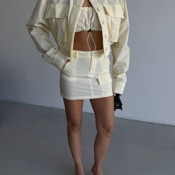 Тройной кремовый комплект: укороченная куртка, топ и мини-юбка